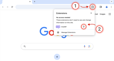Click the puzzle piece (1) in the top right of your browser. Then, click the little pin (2) next to the extension: