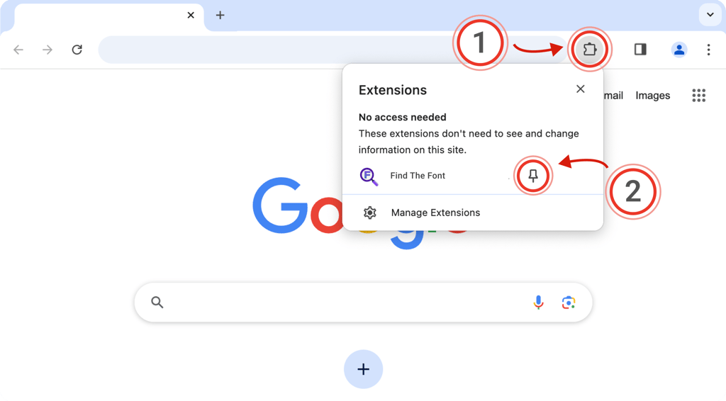 Click the puzzle piece (1) in the top right of your browser. Then, click the little pin (2) next to the extension: