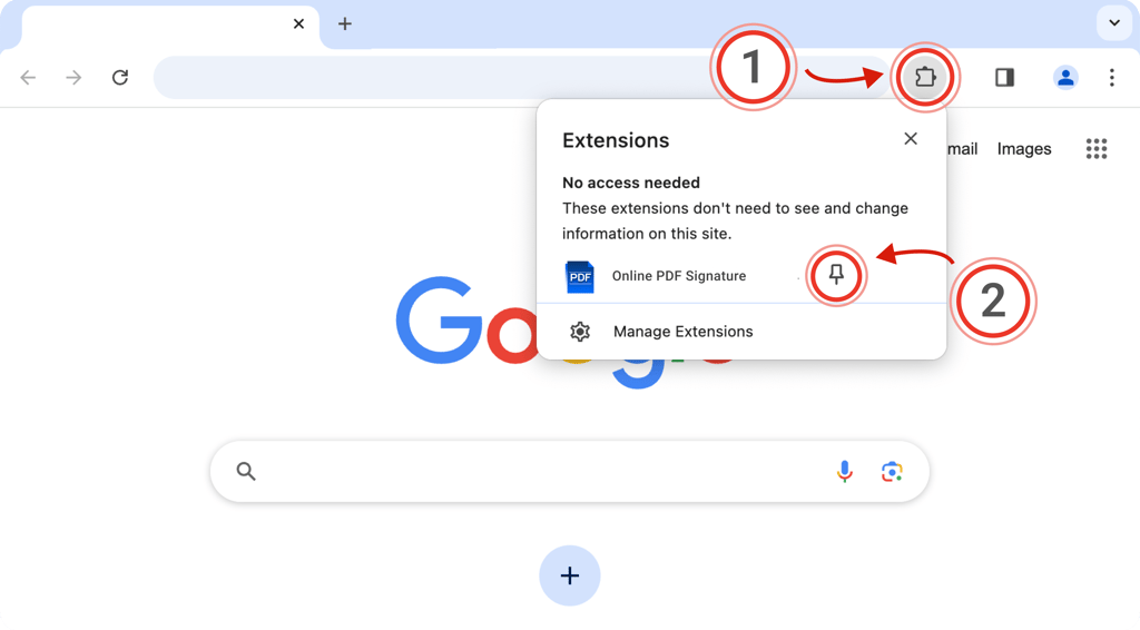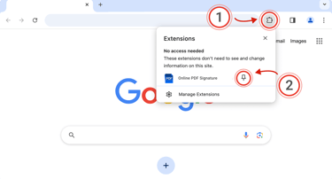 Click the puzzle piece (1) in the top right of your browser. Then, click the little pin (2) next to the extension: