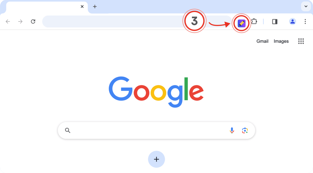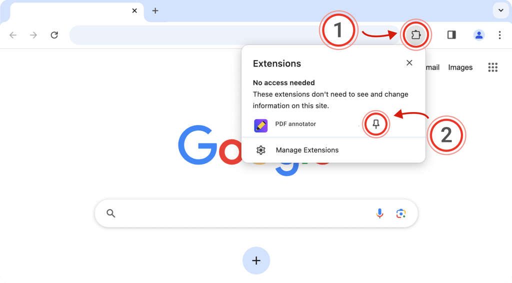 Click the puzzle piece (1) in the top right of your browser. Then, click the little pin (2) next to the extension: