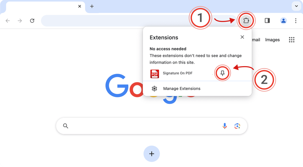 Click the puzzle piece (1) in the top right of your browser. Then, click the little pin (2) next to the extension: