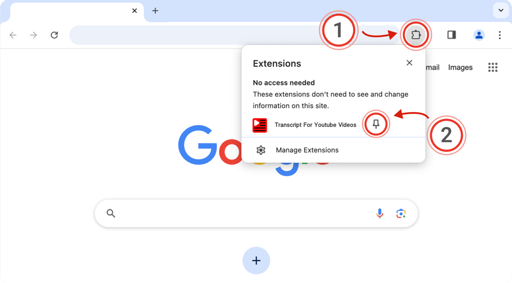 Click the puzzle piece (1) in the top right of your browser. Then, click the little pin (2) next to the extension: