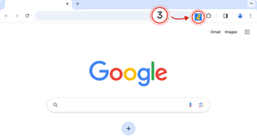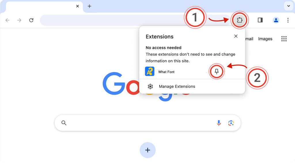 Click the puzzle piece (1) in the top right of your browser. Then, click the little pin (2) next to the extension: